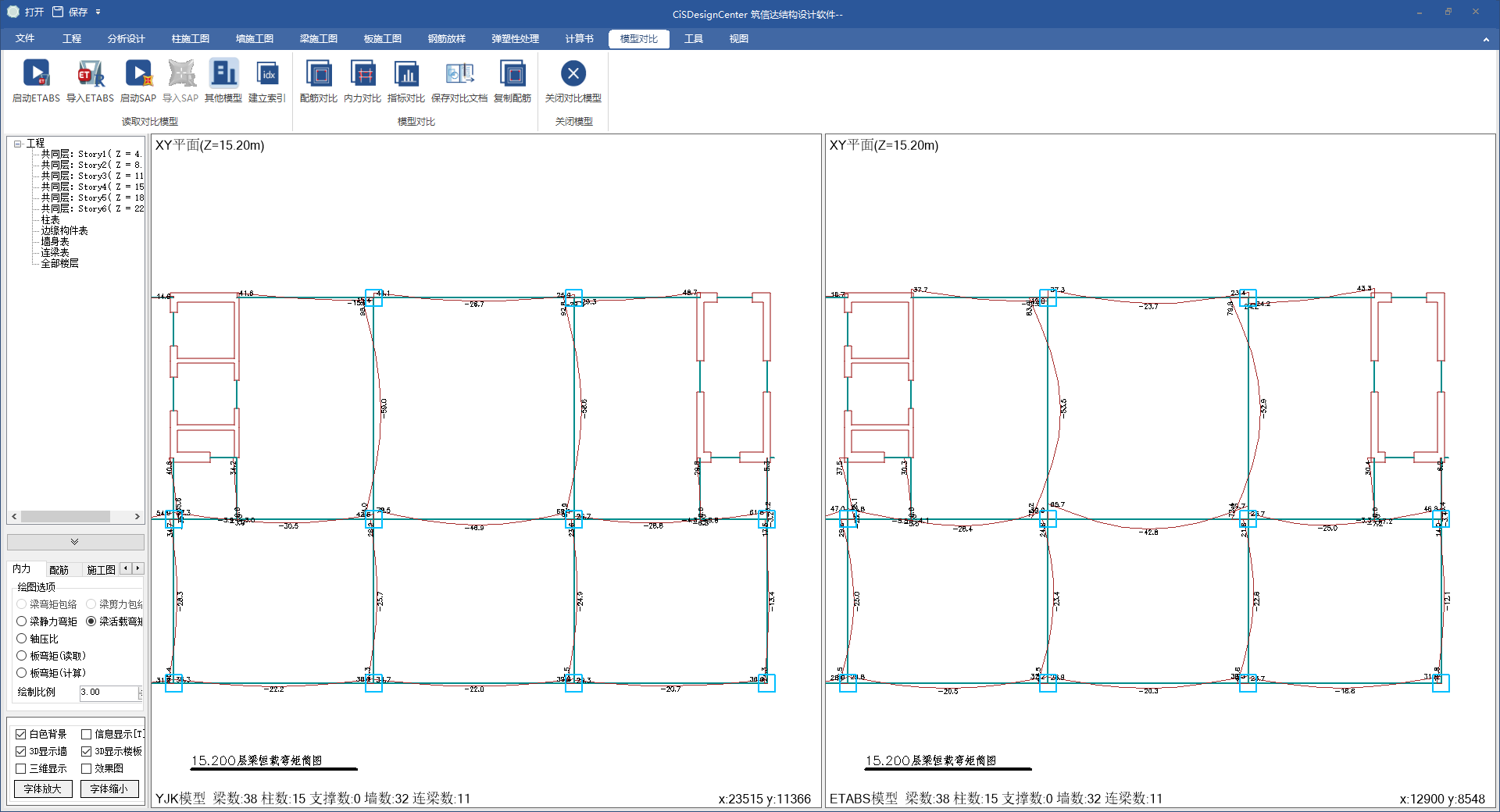 為了便于用戶對項(xiàng)目進(jìn)行二套軟件校核,CiSDC提供了不同模型的結(jié)構(gòu)指標(biāo)對比報(bào)告書,構(gòu)件內(nèi)力對比以及配筋對比等功能。