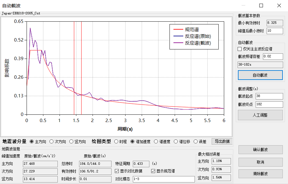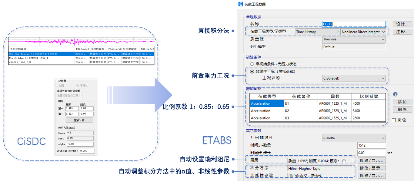 內(nèi)置天然波庫,自動生成人工波。支持人工選波和基于規(guī)范要求的自動選波,并輸出選波報(bào)告。CiSDC可依據(jù)有效持時(shí)裁剪地震波。選波完成后,可在CiSDC更高效地完成時(shí)程工況的定義,并自動轉(zhuǎn)換至ETABS中文版模型中。