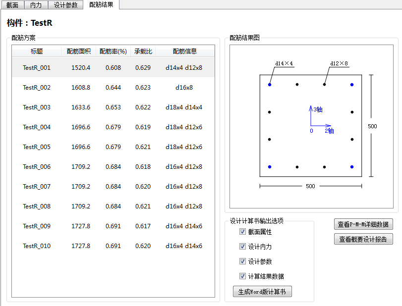 2. 通過(guò)優(yōu)化配筋參數(shù),在滿足規(guī)范規(guī)定和用戶(hù)設(shè)置的前提下,給出多種配筋方案供用戶(hù)選擇。各種方案按配筋率大小進(jìn)行排序,且選筋滿足規(guī)范對(duì)配筋率和鋼筋間距的要求。