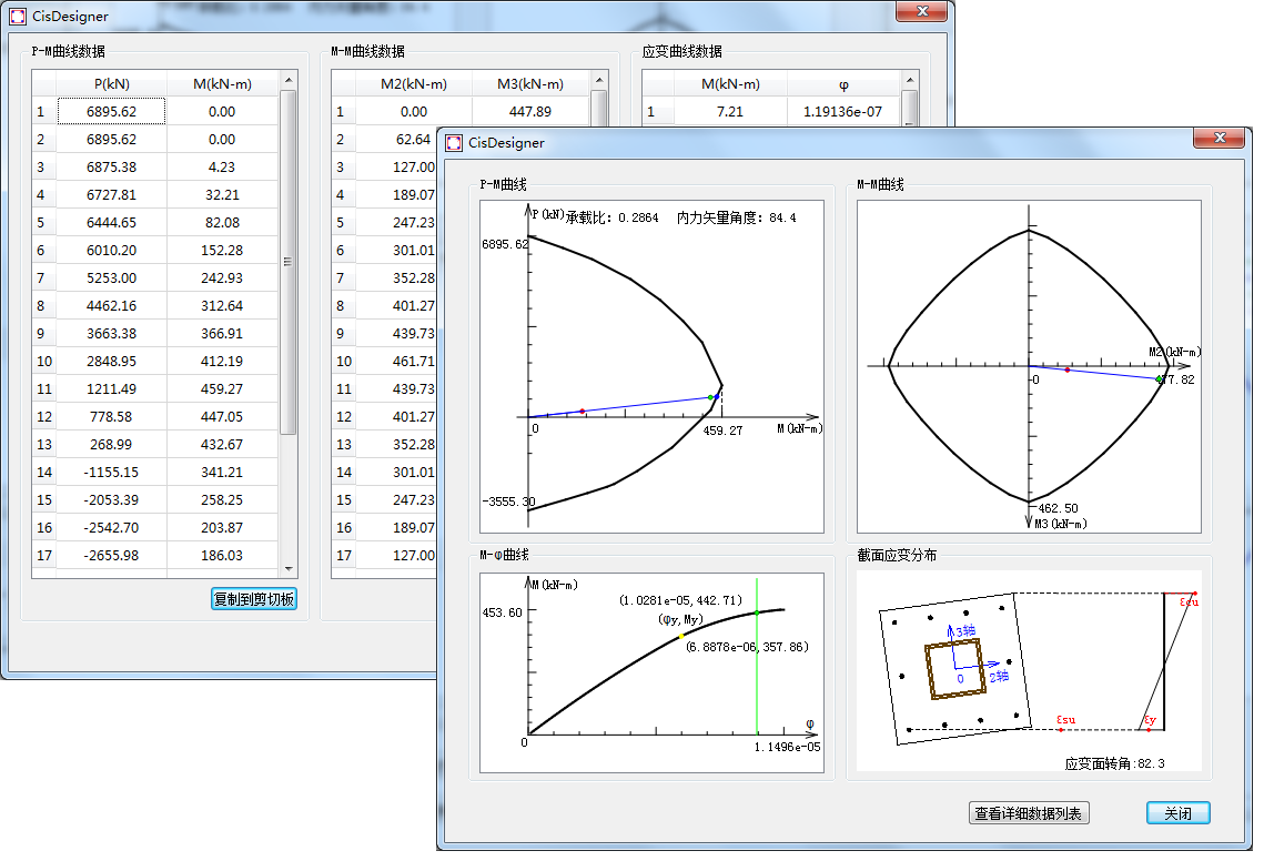 4. 采用空間矢量(P,M,M)算法或MM向量(等軸力)算法驗(yàn)算能力比(Capacity Ratio),并能形象地演示相應(yīng)的加載路徑,包括截面應(yīng)變分布及彎矩曲率(M-φ)圖。相關(guān)計(jì)算原理請(qǐng)查閱軟件技術(shù)說(shuō)明書(shū)。