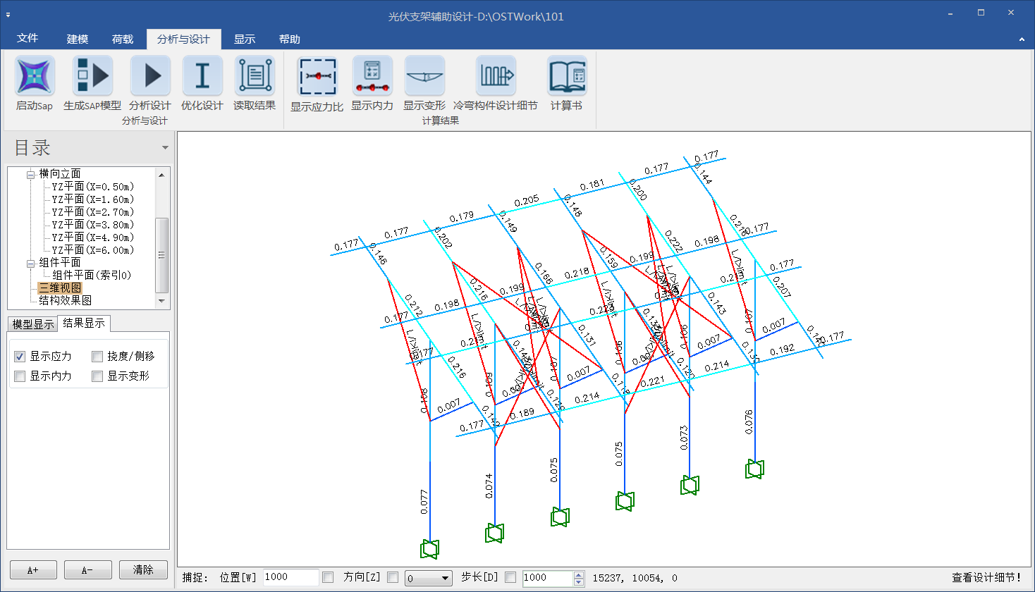 建模完成后,調(diào)用SAP2000中文版軟件生成模型,并進(jìn)行分析與設(shè)計(jì),生成的SAP2000中文版模型是一個(gè)單獨(dú)的文件,分析完成后,可以在SAP2000中文版中查看分析結(jié)果,也可以直接光伏支架軟件中查看分析結(jié)果,包括分析內(nèi)力、變形、撓度等結(jié)果。