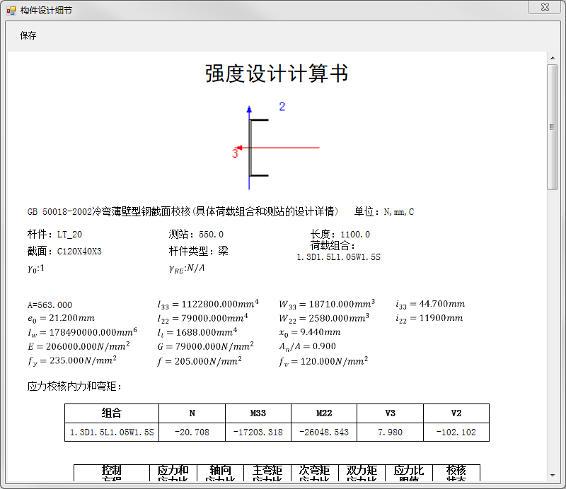 冷彎構(gòu)件的設(shè)計(jì)在PV_SAP中完成,顯示結(jié)果可以顯示應(yīng)力比,也可以顯示冷彎構(gòu)件的設(shè)計(jì)過程。使用冷彎設(shè)計(jì)細(xì)節(jié)功能,可以查看單構(gòu)件在所有荷載情況下的強(qiáng)度設(shè)計(jì)結(jié)果和穩(wěn)定設(shè)計(jì)結(jié)果(圖12)。單擊設(shè)計(jì)過程,可以查看設(shè)計(jì)過程中使用的各項(xiàng)參數(shù)(圖13)。