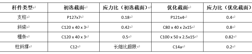 以某單支柱光伏支架為例,初選截面和優(yōu)化后的截面及相應(yīng)應(yīng)力比如下表。從表中可知:當(dāng)初選截面偏大時(shí),優(yōu)化后的截面會(huì)減??;反之則會(huì)增大;程序最終選到滿足要求的最小截面為止。下表中的斜梁和檁條,初選截面偏大,經(jīng)過優(yōu)化后,得到應(yīng)力比為0.8的優(yōu)化截面。對(duì)于下表中的柱斜撐,初選截面為C12,長細(xì)比不滿足限值要求,優(yōu)化后程序按照最小長細(xì)比限值要求(1/120)確定合理截面C14a。對(duì)于下表中的支柱,初選截面為P127x7,計(jì)算后發(fā)現(xiàn)其受力較小,為長細(xì)比控制;程序最終優(yōu)化的截面也是滿足長細(xì)比要求限值(1/150)的截面P121x4。