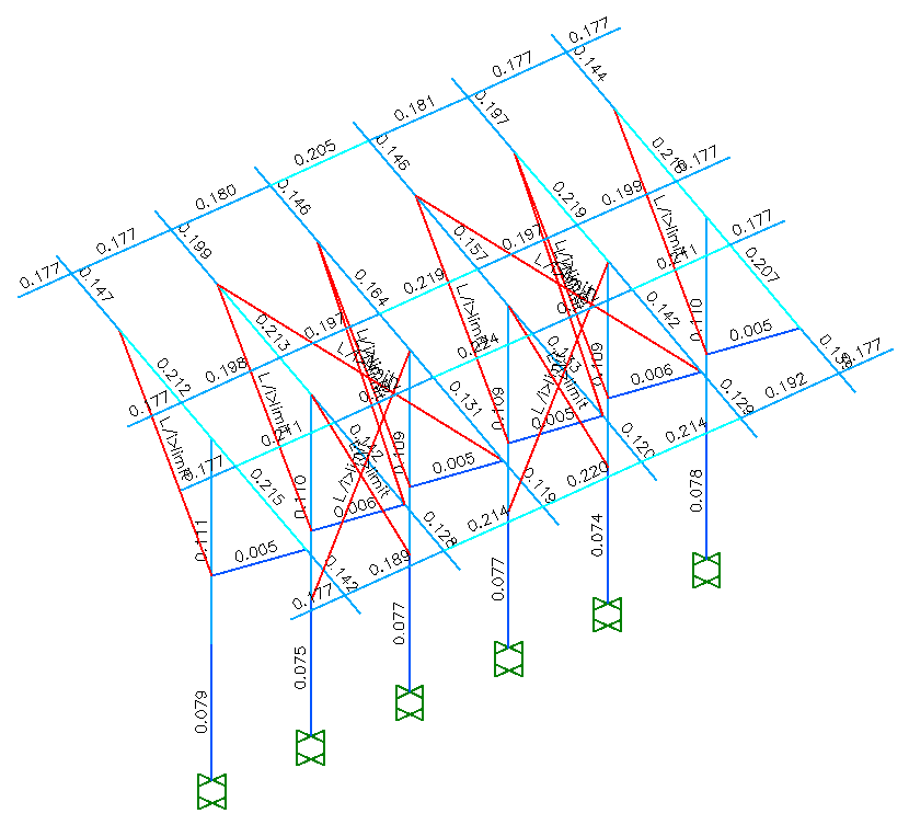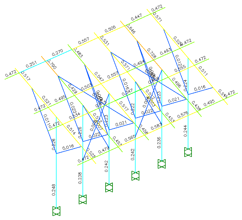 PV_SAP軟件可以進(jìn)行鋼構(gòu)件設(shè)計(jì)和冷彎薄壁桿件設(shè)計(jì),并支持構(gòu)件的優(yōu)化設(shè)計(jì)。鋼構(gòu)件設(shè)計(jì)使用SAP2000中文版的設(shè)計(jì)結(jié)果,冷彎構(gòu)件設(shè)計(jì)是根據(jù)SAP2000中文版軟件分析的內(nèi)力結(jié)果,在PV_SAP中依據(jù)規(guī)范進(jìn)行構(gòu)件的設(shè)計(jì)。設(shè)計(jì)完成后,可以查看各構(gòu)件的應(yīng)力比結(jié)果。如圖12所示。