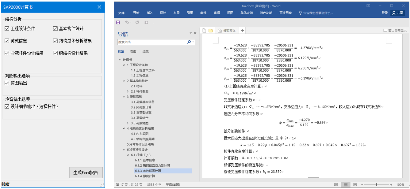 計(jì)算書部分可以設(shè)置輸出的計(jì)算內(nèi)容,在輸出冷彎構(gòu)件的設(shè)計(jì)結(jié)果時(shí),可以按照表格方式輸出,也支持設(shè)計(jì)過程輸出。如圖15所示。在計(jì)算書中,也輸出了荷載簡圖和內(nèi)力簡圖。