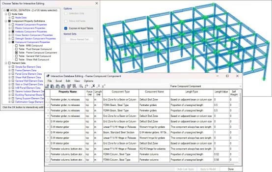 - 組件屬性數(shù)據(jù)的編輯,包括對所有材料(Materials)、彈性組件(Elastic Components)、截面(Cross Sections)、強(qiáng)度截面(Strength Sections)、復(fù)合組件(Compound Components)以及大多數(shù)塑性組件(Inelastic Components)的屬性進(jìn)行添加、刪除或修改