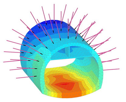 在PLAXIS 2D和3D中的隧道設(shè)計器可以使用板單元或者實體單元快速地模擬噴射混凝土襯砌或者鉆挖隧道。并且可以模擬錨桿,注漿壓力,千斤頂推力,隧道掌子面壓力以及體積損失。嚴格意義上說,隧道開挖是三維問題。但是對于符合平面應(yīng)變條件時,隧道掘進和掌子面應(yīng)力釋放問題使用收斂-約束法也可以用PLAXIS 2D考慮。另外,對于支護的設(shè)計和支護安裝位置的確定應(yīng)該使用PLAXIS 3D。噴射混凝土模型可以考慮混凝土強度和剛度隨時間變化,以及混凝土的收縮和蠕變。除此之外,還能夠模擬加固隧道的錨桿。PLAXIS能夠準確地預(yù)測淺埋和深埋隧道開挖過沖中對周邊土層或巖體的響應(yīng)。