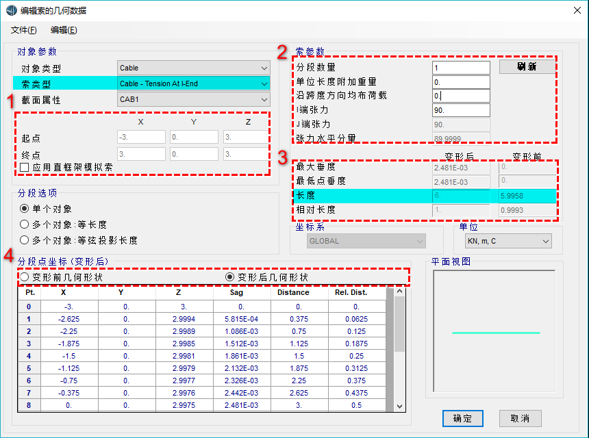 繪制索單元時,用戶通過連接兩個節(jié)點的方式來繪制。紅色選框1中,會顯示索單元兩端的兩個節(jié)點,通過兩個節(jié)點坐標(biāo)可以得到索單元的弦長(兩端點的直線距離),上圖中索的弦長為6m。軟件也會計算出索在變形前的及幾何形狀,勾選紅框4中的變形前幾何形狀,即會顯示各個剖分節(jié)點坐標(biāo)。