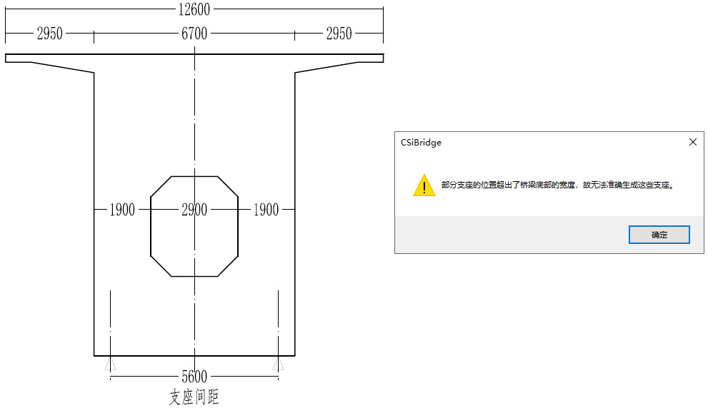 采用橋?qū)ο髞斫蛄耗P投x橋梁中間跨支座時(shí),其主梁橫斷面如下圖中所示,其中橋梁底部寬度為6.7m,定義支座寬度為 5.6m。此時(shí)程序提示:“部分支座寬度超出了橋梁底部的寬度,無法準(zhǔn)確的生成這些支座”,提示窗口如下所示。但是梁底寬度6.7m>支座寬度5.6m,為何出現(xiàn)該警告?