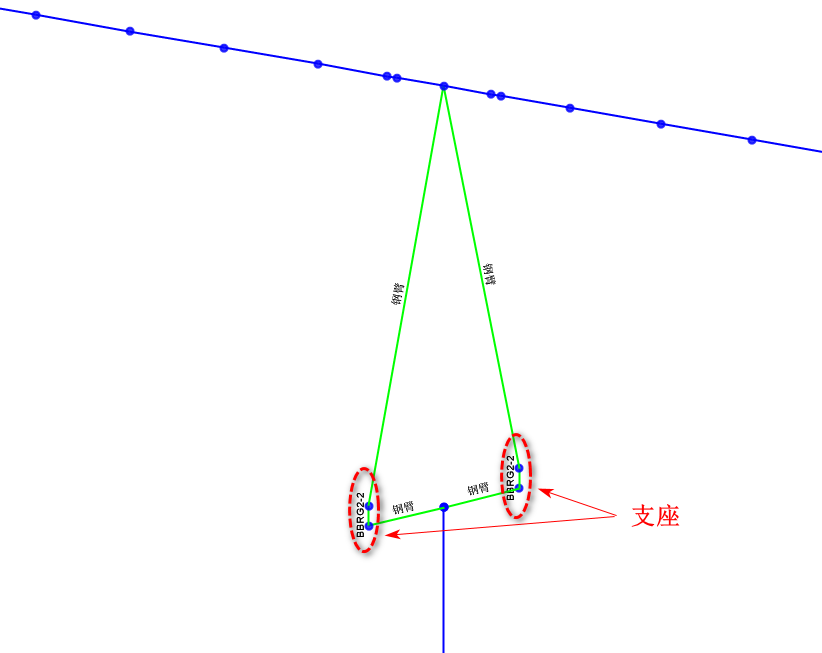 當(dāng)出現(xiàn)由于支座寬度較寬而無法通過橋?qū)ο髞矶x支座時(shí),用戶可先定義一個(gè)滿足橋?qū)ο笠蟮闹ё扇珮蚰P停缓髣h除由橋?qū)ο笊傻闹ё捎酶呒?jí)選項(xiàng)卡中的繪制功能來手動(dòng)繪制支座連接單元。對(duì)于支座和主梁、橋墩之間的連接方式,可以采用連接單元或節(jié)點(diǎn)約束來處理。如下圖中采用連接單元來處理主梁和支座頂之間的連接關(guān)系。