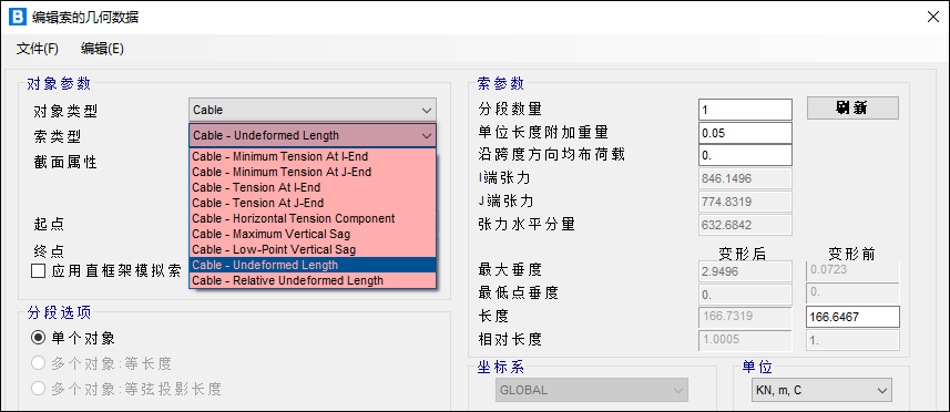 需要注意的是:交互式數(shù)據(jù)表格中【Cable Type】與【編輯索的幾何數(shù)據(jù)】窗口中索類型是對應(yīng)的,表明該索的初始幾何信息是通過哪種方式定義的。如上述問題中交互式數(shù)據(jù)表格【Cable Type】為“Undeformed Length