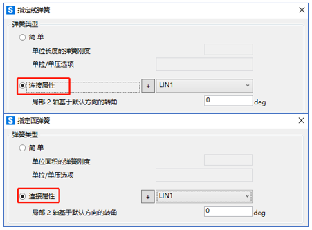 為框架或面對(duì)象指定彈簧類型的時(shí)候,有"簡單"與"連接屬性"兩種定義方式,如下圖所示。