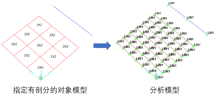 添加之前定義的連接單元LIN1,連接單元?jiǎng)偠鹊牧烤V是“F/L”,連接單元中線彈簧和面彈簧的系數(shù)的量綱分別為“L”和“L^2”,此時(shí)線彈簧或面彈簧的量綱分別為“F/L^2”和"F/L^3"。以單位制kN-m-C為例,線彈簧與面彈簧的單位分別為kN/m/(1m)、kN/m/(1m^2),此處括號(hào)中的1對(duì)應(yīng)圖1紅框中的系數(shù)1,也可以根據(jù)需要設(shè)定該系數(shù)為a。將線彈簧或面彈簧指定給對(duì)象,在對(duì)象被分割或剖分后,生成分析模型的過程中,軟件自動(dòng)在每個(gè)節(jié)點(diǎn)處生成等效的點(diǎn)彈簧,如下圖所示。