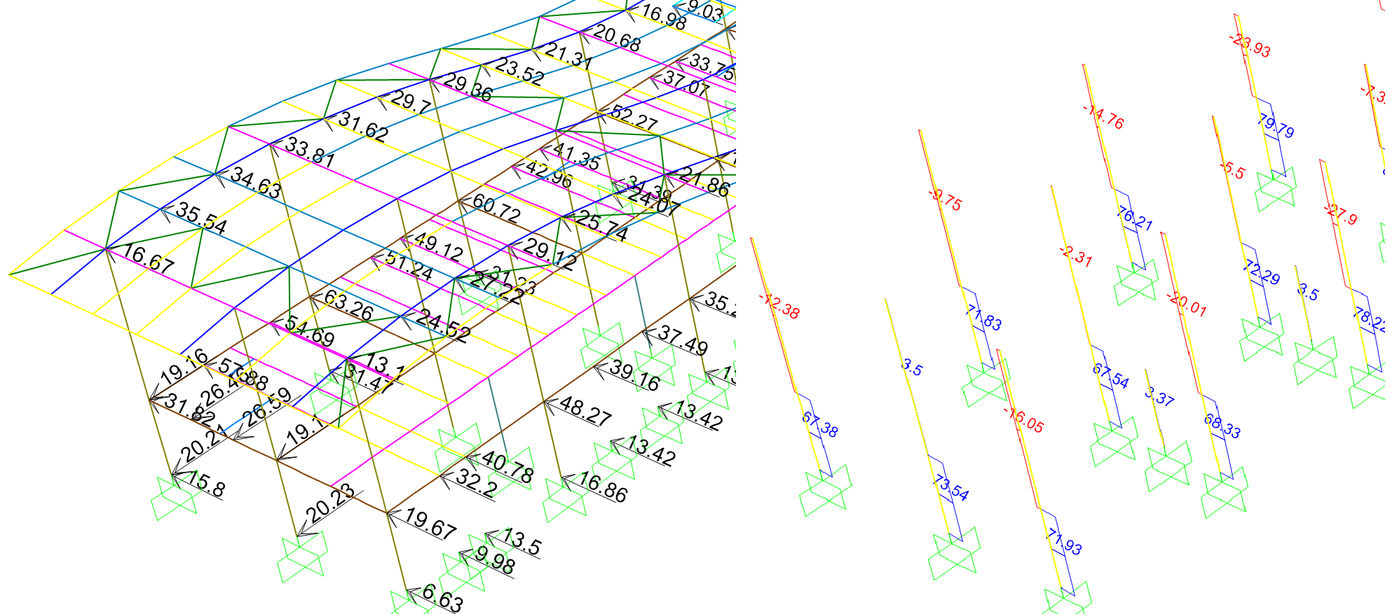 如上所示,對波浪造型屋面的開敞結(jié)構(gòu)基于虛面施加風(fēng)荷載,荷載分布如下左圖,柱剪力分布如下右圖。可以看見圖中柱內(nèi)力遠(yuǎn)遠(yuǎn)小于外荷載,甚至出現(xiàn)內(nèi)力與荷載反向的情況,原因是什么?