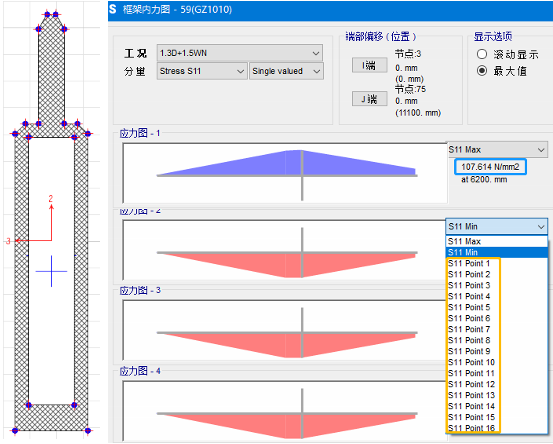SD 截面中用于輸出截面應(yīng)力的默認(rèn)應(yīng)力點(diǎn)為該截面的矩形外包框的四個(gè)角點(diǎn)和截面形心。因此,對(duì)于如下所示的異形 SD 截面,矩形外包框的四個(gè)角點(diǎn)位于該截面的實(shí)體區(qū)域之外,基于該應(yīng)力點(diǎn)的正應(yīng)力 S11 (如 467.087MPa)無實(shí)際意義。如果沿該截面的實(shí)體區(qū)域邊界自定義十六個(gè)應(yīng)力點(diǎn)(如以下左圖中的藍(lán)點(diǎn)所示),則最大的截面正應(yīng)力 S11 為 107.614MPa,小于 Q235 的強(qiáng)度設(shè)計(jì)值。