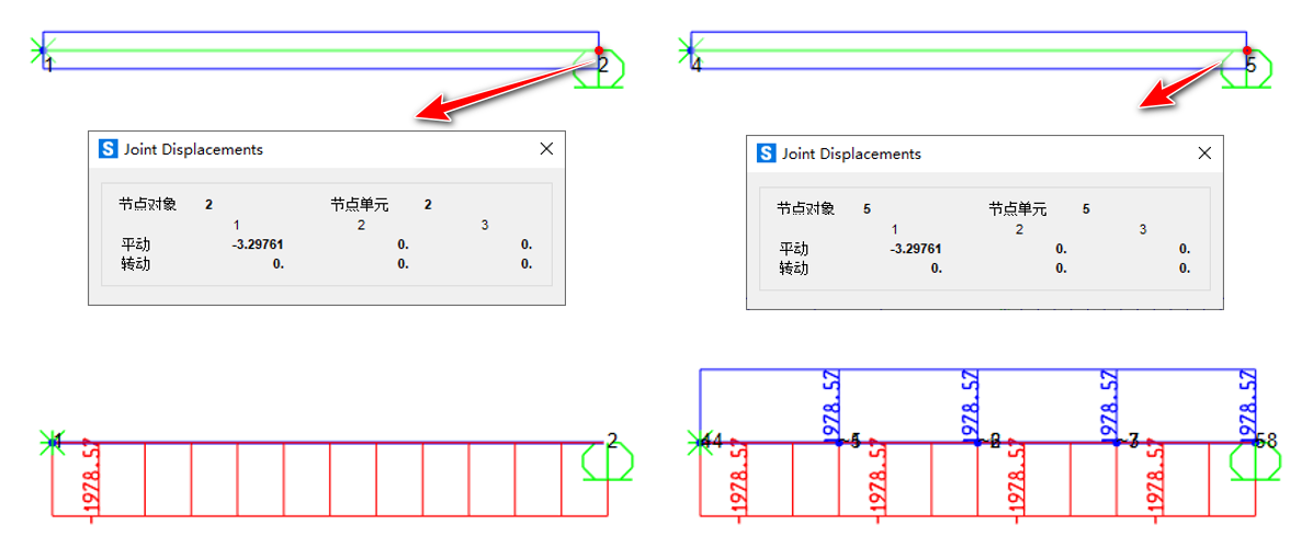 分析完成后,再次查看梁端位移,可以看到左側(cè)模型和右側(cè)模型的梁端位移相同,均縮短了3.29761m。查看梁的軸力圖可以看到,梁兩端的軸壓力均為1978.57KN,兩種模擬方式等效。