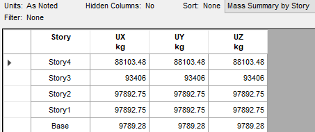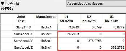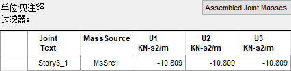 由于ETABS中無法輸出負(fù)質(zhì)量的具體數(shù)值,現(xiàn)通過一個(gè)完全相同的SAP2000模型進(jìn)行驗(yàn)證。可以看見SAP2000輸出的節(jié)點(diǎn)1質(zhì)量為-10809kg,節(jié)點(diǎn)總質(zhì)量為376275.3kg,與ETABS中輸出的Group All一致。可得376275.3+10809=387084.3kg,與ETABS中的樓層總質(zhì)量一致