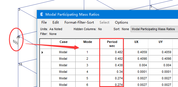 實(shí)際上,負(fù)質(zhì)量是沒有物理意義的,程序在進(jìn)行模態(tài)分析、反應(yīng)譜分析等結(jié)構(gòu)分析時(shí)并不會(huì)考慮。現(xiàn)將施加在節(jié)點(diǎn)1豎直向上的300kN集中力修改為600kN,可以看見ETABS的樓層總質(zhì)量與周期均未發(fā)生變化,如下所示: