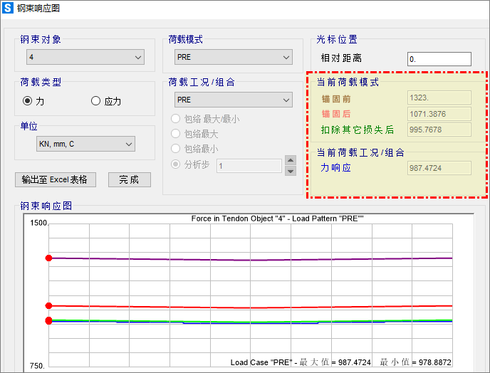 Seating):表示鋼束錨固后,扣除了 ① 預(yù)應(yīng)力鋼筋與管道壁之間摩擦引起的預(yù)應(yīng)力損失+ ② 錨具的變形與滑移引起的預(yù)應(yīng)力損失,此時鋼束的預(yù)應(yīng)力數(shù)值采用紅色線條表示;
