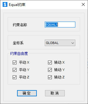 在定義 Equal 約束時,其定義界面和 Body 約束相同,同樣是對六個自由度進行勾選,定義窗口如下圖所示。Body 約束和 Equal 約束有何區(qū)別?