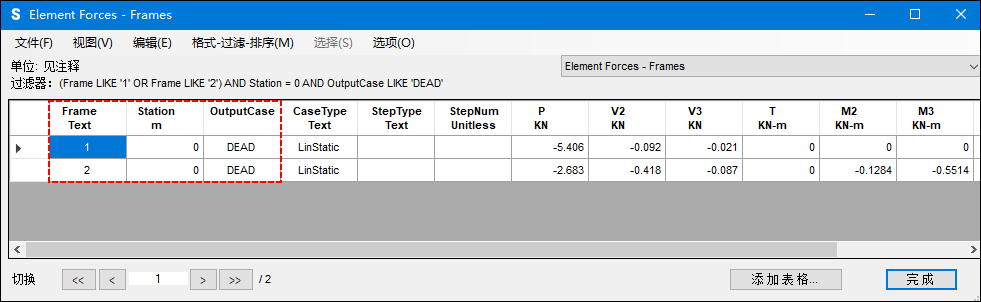 通過應(yīng)用如圖5所示的SQL字符串,可以篩選框架單元1和2,且僅包含測站0和荷載工況DEAD的行結(jié)果,過濾結(jié)果如圖6所示。