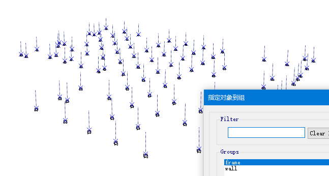 如下圖所示,選中該層框架柱和柱底節(jié)點(diǎn),通過(guò)【指定】>【對(duì)象組】,將其指定到自定義的“frame”對(duì)象組中。同理,選中該層端柱、剪力墻和構(gòu)件底部節(jié)點(diǎn),指定后可以得到自定義的“wall”對(duì)象組。