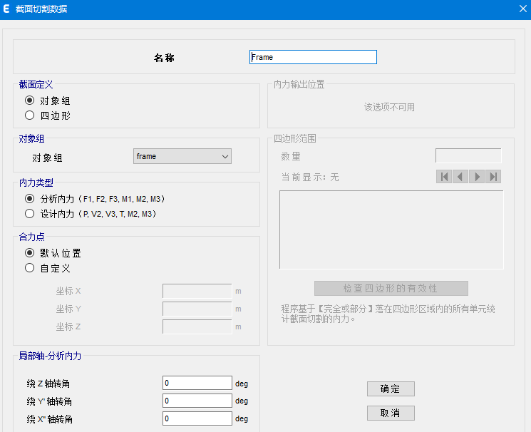 然后點(diǎn)擊【定義】>【截面切割】,基于對(duì)象組定義截面切割,合力點(diǎn)默認(rèn)為對(duì)象組中所有點(diǎn)對(duì)象的幾何中心,也可以勾選“自定義”,手動(dòng)調(diào)整合力點(diǎn)坐標(biāo)。