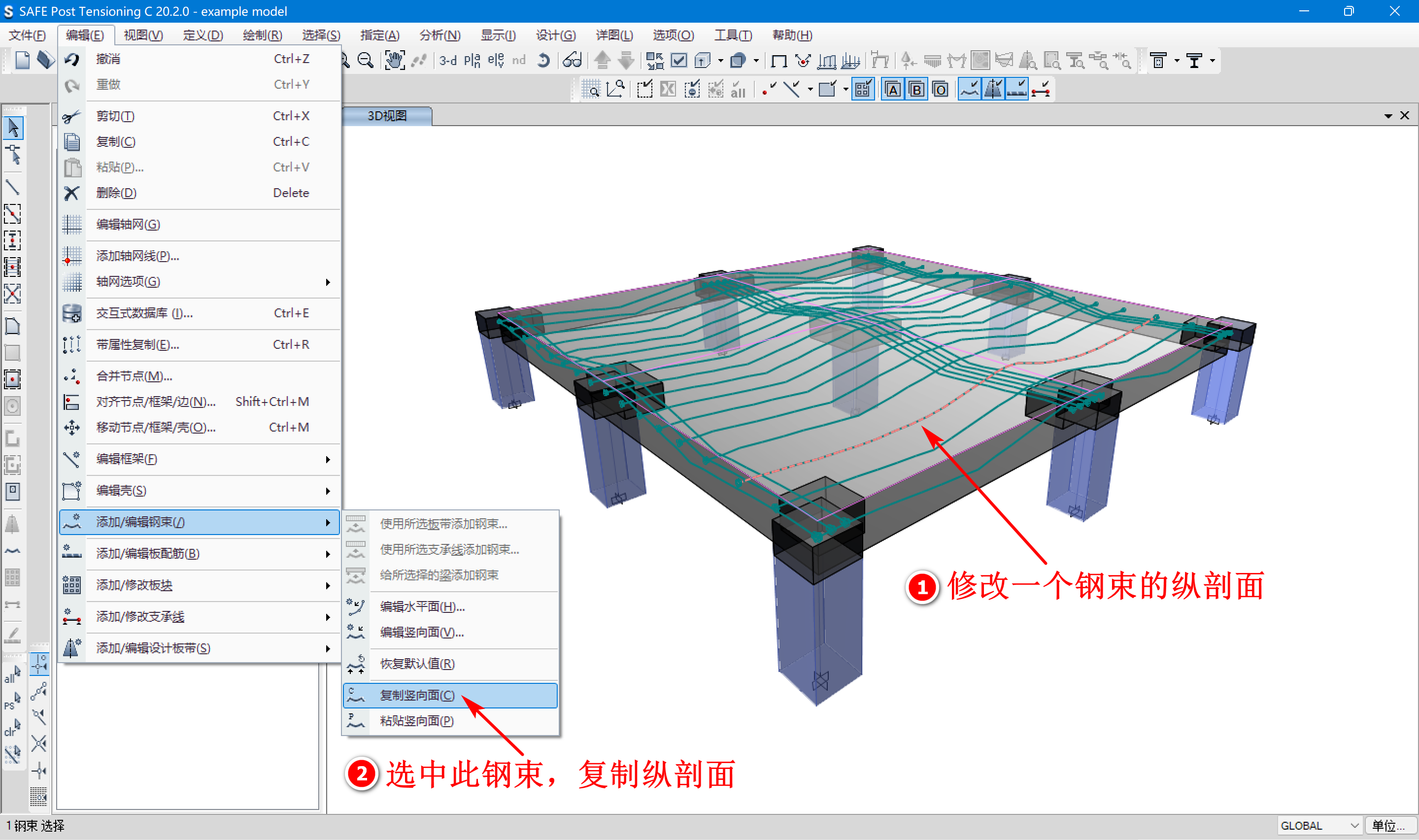首先,修改任意一個(gè)鋼束的縱剖面,可直接右鍵單擊鋼束或選擇鋼束后點(diǎn)擊菜單欄【編輯>添加/編輯鋼束>編輯縱剖面】進(jìn)行修改。然后,再次選擇此鋼束,點(diǎn)擊菜單欄【編輯>添加/編輯鋼束>復(fù)制縱剖面】,此時(shí)程序?qū)⒖v剖面數(shù)據(jù)復(fù)制到剪貼板中。注意該命令只有當(dāng)選擇一個(gè)鋼束時(shí)可用。該步的操作如圖1所示。