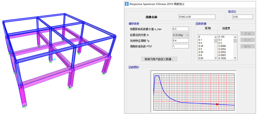 建模時,對于鋼混結(jié)構(gòu)可以將反應(yīng)譜曲線的阻尼比可設(shè)置為0.05(或其他數(shù)值),模態(tài)阻尼則通過材料阻尼定義,如鋼材的阻尼比設(shè)置為0.03,混凝土的材料阻尼比設(shè)置為0.05。注意,此時反應(yīng)譜函數(shù)阻尼比與混合結(jié)構(gòu)的實(shí)際阻尼比并不一致。
