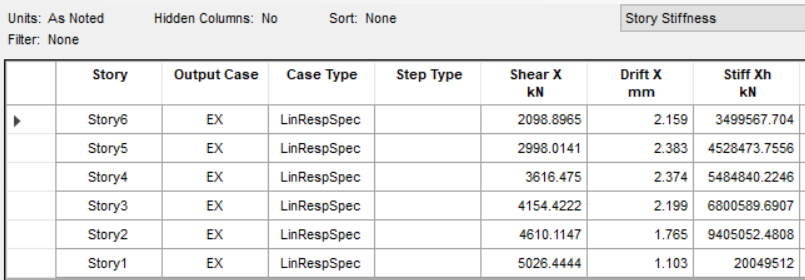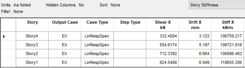 某L形框架結(jié)構(gòu),層高3m。查看X方向的層剛度結(jié)果如下,即"層剛度Stiff = 層剪力Shear / 層間位移Drift":