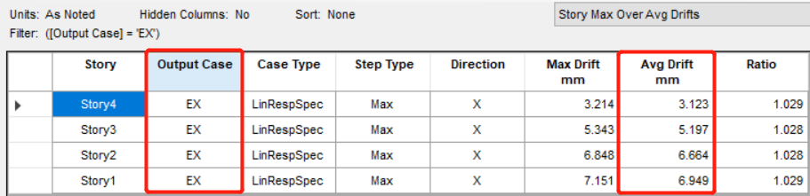 注:ETABS V20.3及以上版本,可以在Story max avg drifts中直接查看反應(yīng)譜工況下的層間位移結(jié)果。