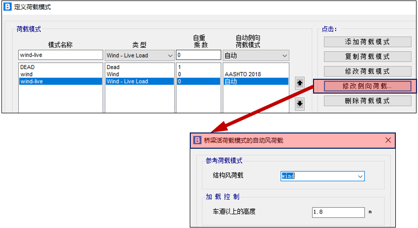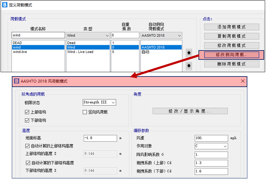 (1)首先定義“Wind”荷載模式。如下圖所示,在“荷載類型”中選擇“Wind”,在“自動(dòng)側(cè)向荷載模式”中選擇相應(yīng)荷載規(guī)范,這里選擇的是“AASHTO 2018”。選擇相應(yīng)的規(guī)范后,點(diǎn)擊選項(xiàng)卡右側(cè)的“修改側(cè)向荷載”選項(xiàng),在該選項(xiàng)卡中指定相應(yīng)的風(fēng)荷載參數(shù)。