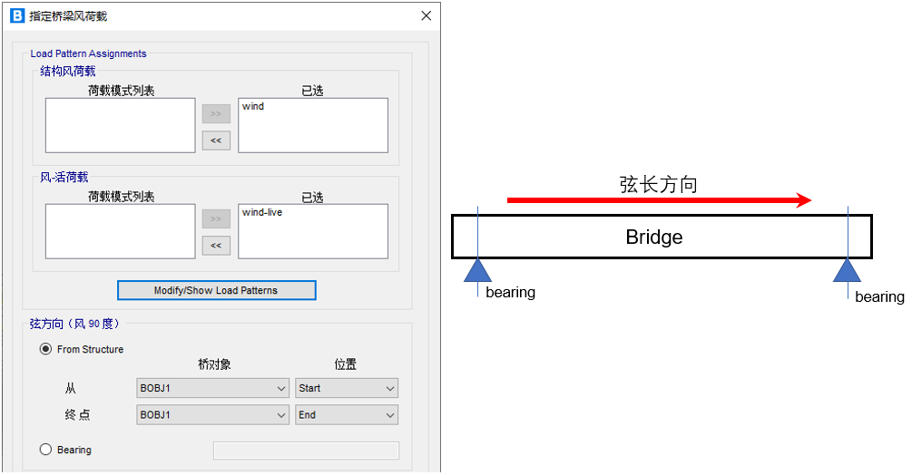 (3)對(duì)“橋?qū)ο蟆敝付L(fēng)荷載和橋梁的弦長(zhǎng)方向。在“橋梁選項(xiàng)卡>荷載>風(fēng)荷載”中為橋?qū)ο笾付ㄒ讯x的風(fēng)荷載。定義界面如下圖所示,添加已定義的結(jié)構(gòu)風(fēng)荷載和風(fēng)-活荷載。另外還需要指定橋梁的弦長(zhǎng)方向,可通過橋?qū)ο蟮钠鹗键c(diǎn)和終止點(diǎn)確定,或通過支座確定。弦長(zhǎng)方向用于確定風(fēng)吹的角度,弦長(zhǎng)方向與風(fēng) 90 度的方向一致。