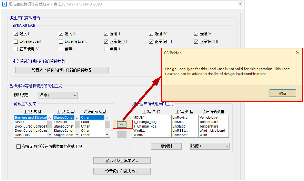 鋼混組合梁橋設(shè)計時需要考慮不同施工階段下組合梁的截面屬性及承受荷載的變化,因此需要將階段施工工況與活載、地震作用、風(fēng)荷載及溫度作用進(jìn)行組合。但是,在將階段施工工況添加到“用于生成荷載組合的工況”時,程序提示 “階段施工工況無法用于生成荷載組合”,如下圖所示。請問該如何處理?