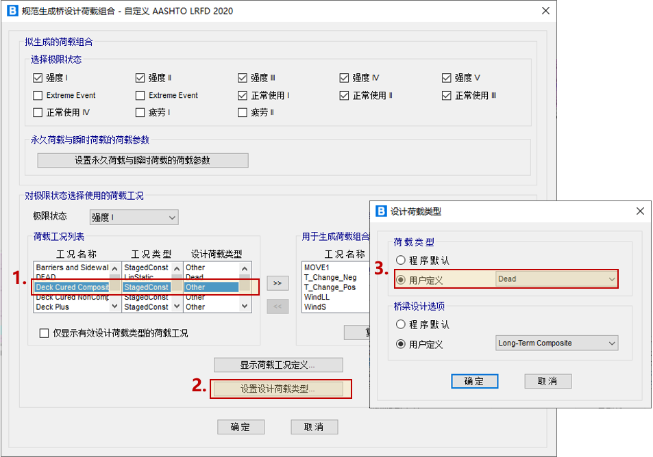 Cured Composite”階段施工工況的“設(shè)計荷載類型”應(yīng)該指定為“Dead”。通過操作:選擇“Deck Cured Composite”工況> 設(shè)置設(shè)計荷載類型>荷載類型,修改為用戶定義,將其荷載類型設(shè)置為“Dead”,操作如下。