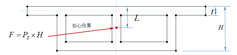 CSiBridge 風荷載施加于主梁頂面,故自動確定截面形心與主梁頂面之間的距離 L,以此計算風荷載作用于頂面的每延米的等效彎矩 M。這里需要注意兩點,(1)CSiBridge 中的等效風荷載和等效彎矩等分為三份,分別施加于橋面板的中點和兩邊橋面板寬度 1/4 位置處。(2)頂板采用殼單元建模時,頂板的插入點為面截面的中心面,計算附加彎矩 M 時應扣除頂板厚度 t 的一半。計算簡圖如下: