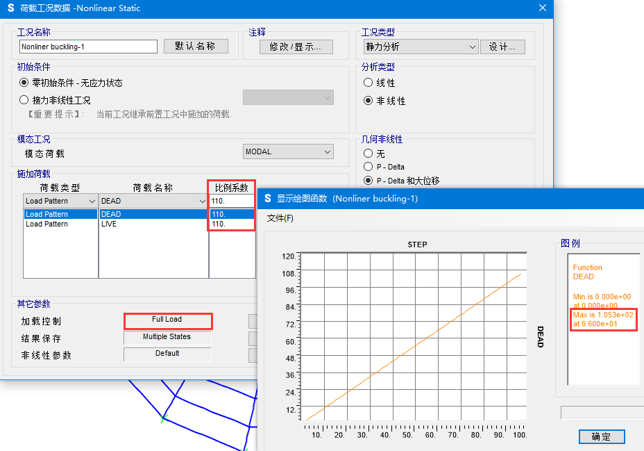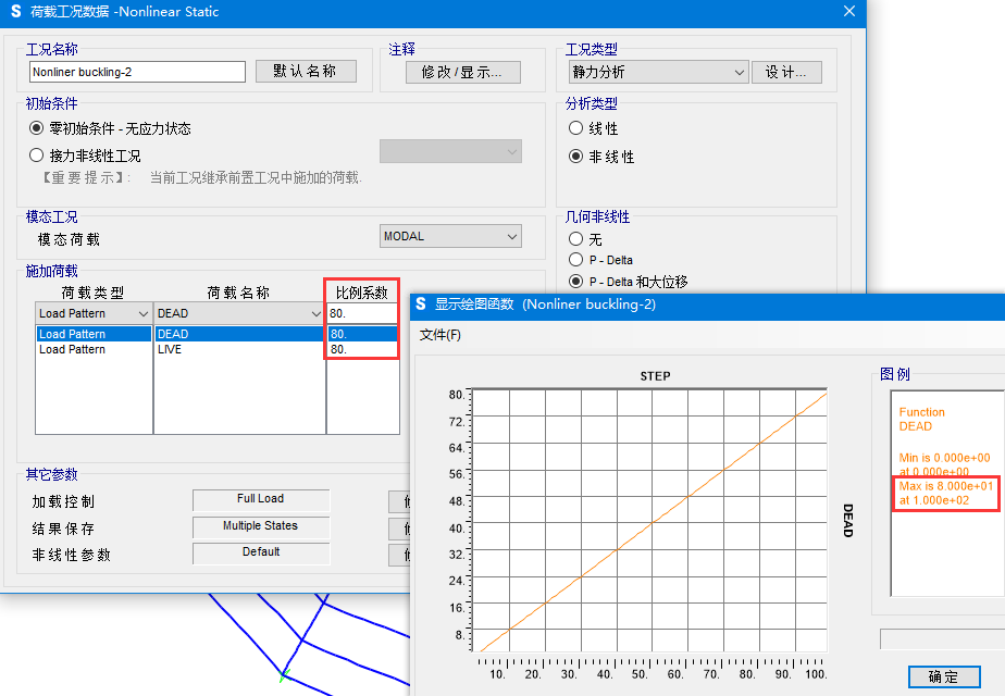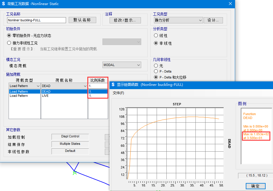 當采用位移控制時,“比例系數(shù)”只表示相對比例,不代表荷載的絕對數(shù)值。如圖1中定義的比例系數(shù),表示著恒載DEAD和活載LIVE按1:1施加,程序?qū)⒏鶕?jù)目標位移自動調(diào)整施加的荷載大小。