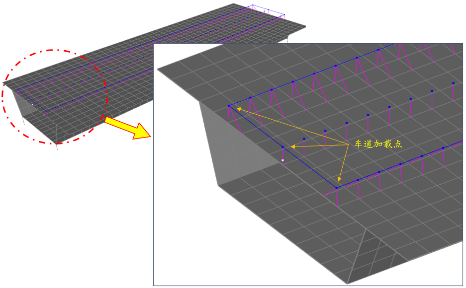 程序會(huì)依據(jù)車道設(shè)置和橋梁參數(shù)及其位置關(guān)系離散車道,在車道上形成眾多的荷載加載點(diǎn),如上圖中的藍(lán)色圓點(diǎn)所示。該節(jié)點(diǎn)承受的荷載將傳遞給主梁上(同一個(gè)橫斷面)相鄰的節(jié)點(diǎn),在上圖中其傳遞路徑采用粉色線框表示,該粉色線框并不是剛性桿,僅表示荷載傳遞的路徑。