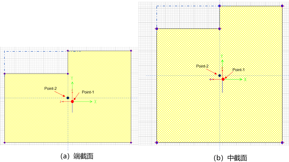如果忽略 L 形截面中缺失的左上角,矩形截面的中心點為圖中 Point-2。導(dǎo)入 SD 截面設(shè)計器后的局部坐標(biāo)系原點設(shè)置在 Point-2 并以此作為截面的插入點。此時,插入點和截面形心一致,在定義變截面時,各段截面左右及上下將是對齊的。