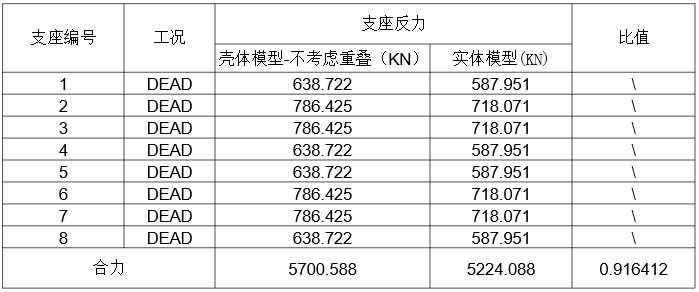 將模型分別離散為殼體模型(不考慮重疊)和實(shí)體模型,提取在 DEAD 工況下各個(gè)支座的反力,并計(jì)算支座反力的總合,如下表所示。其中,實(shí)體模型的總反力為 5224.088,殼體模型(不考慮重疊)的總反力為 5700.588,兩者的比值為 5224.088/5700.588=0.9164,與上圖中的修正系數(shù)一致。