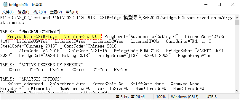 2. 在記事本中打開上述 b2k 文本文件。在“Program Control”一欄中會顯示當前數(shù)據(jù)支持的軟件為“CSiBridge”,軟件版本為“V25.0.0”,如下圖所示。這里需要將軟件名稱修改為“SAP2000”,軟件版本修改 SAP2000 版本號。修改完成后,保存文件,然后將修改后的文本文件的后綴改為 $2k。