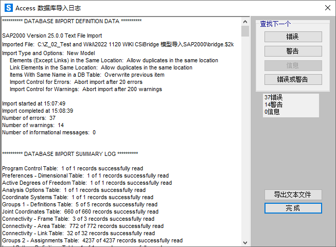 3. 在 SAP2000 中點擊【文件>導入>SAP2000 文本文件】命令,選擇上述修改后的 $2k 文件,SAP2000 將讀取該文本文件中的數(shù)據(jù)。導入完成后,SAP2000 會彈出數(shù)據(jù)導入記錄文件,如下圖所示。