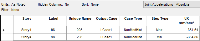 查看第四層所有節(jié)點的絕對加速度(圖 4),需要注意的是,表格中的 max 和 min 表示的是方向,應(yīng)取兩者絕對值的最大值,可以看見最大值為角部 4 號節(jié)點的365.75mm/s2,與“Story Accelerations”中輸出的結(jié)果一致(圖 5),說明表格中輸出的為所有節(jié)點的最大絕對加速度。