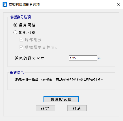 (2) 對(duì)于殼單元類型的水平樓板,程序默認(rèn)進(jìn)行通用網(wǎng)格剖分;