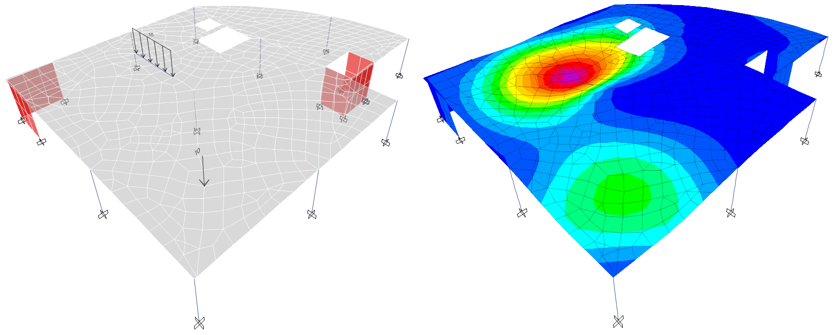 如圖6所示,首先在樓板上繪制節(jié)點(diǎn)和虛梁并分別施加集中力和均布荷載,然后指定樓板剖分包含集中力作用的節(jié)點(diǎn),框架無需設(shè)置。最終通過樓板變形圖可以判斷,荷載準(zhǔn)確地傳遞至樓板。