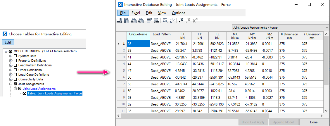 可以通過交互式數(shù)據(jù)庫編輯功能批量更新上部結構傳至基礎的力。