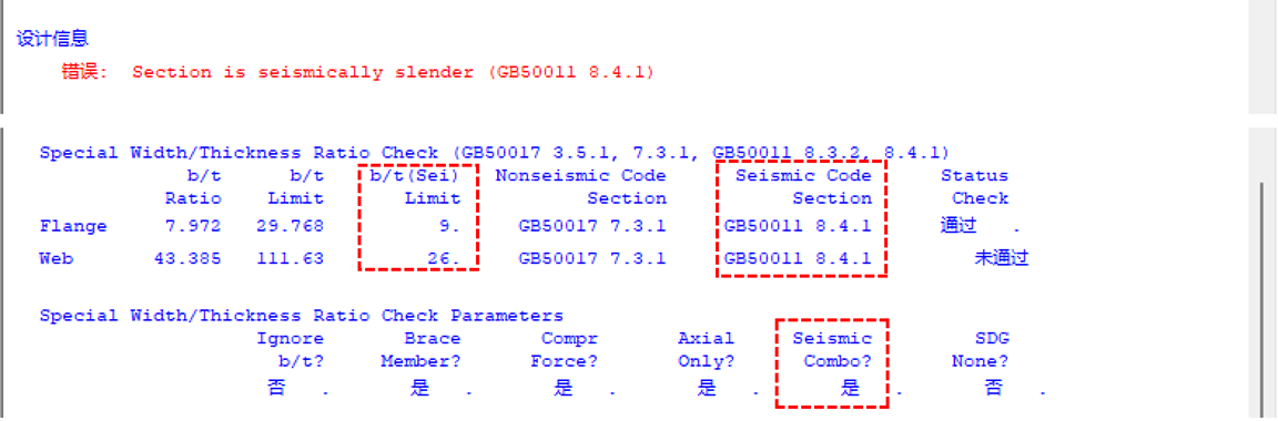 SAP2000中鋼結(jié)構(gòu)板件寬厚比的校核,對于非抗震組合和非抗震構(gòu)件,僅按照《鋼結(jié)構(gòu)設(shè)計標準》GB50017-2017(簡稱“新鋼標”)第3.5.1條、第7.3.1條(第7.3.2條)控制;對于抗震組合構(gòu)件,在新鋼標的基礎(chǔ)上補充按照《建筑抗震設(shè)計規(guī)范》GB50011-2010(簡稱“抗規(guī)”)第8.3.2條、第8.4.1條取包絡(luò)控制。當(dāng)板件寬厚比超過相應(yīng)的限值要求時,程序會在設(shè)計細節(jié)中給出“Section is