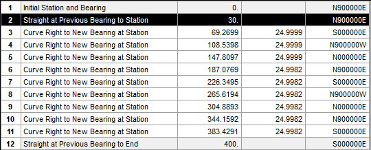 Right to New Bearing at Station)”的方式定義。該方式可以定義帶有回旋線的公路曲線,但是每節(jié)段的轉角不能大于 180°。因此,對于上述問題,需要將數(shù)據(jù)分成多段分別定義,并輸入半徑和轉角,具體輸入數(shù)據(jù)如下:
