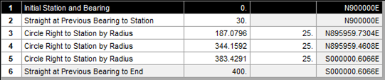 另一種是通過節(jié)段曲線“圓曲線(Circle Right to Station by Radius)”的方式定義,該定義方式適用于不需要定義回旋線的高速公路橋梁。通過該方式定義時,僅需要指定曲線的起點里程和方向,沒有節(jié)段轉角限制,定義方式更簡潔。定義完成后的數(shù)據(jù)如下圖所示: