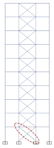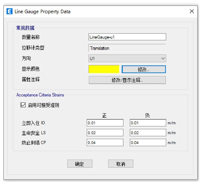 本例為一個(gè)框架-支撐結(jié)構(gòu),為監(jiān)測(cè)底層斜撐的軸向變形,沿著桿件繪制了兩點(diǎn)位移計(jì),即圖中的綠色線條。兩點(diǎn)位移計(jì)類型為“Translation”,方向?yàn)?/span>U1,即沿著位移計(jì)軸向,U2和U3為剪切方向,其中U3默認(rèn)沿著全局X軸。本例中可接受準(zhǔn)則按默認(rèn)設(shè)置,用戶可根據(jù)實(shí)際需求調(diào)整。